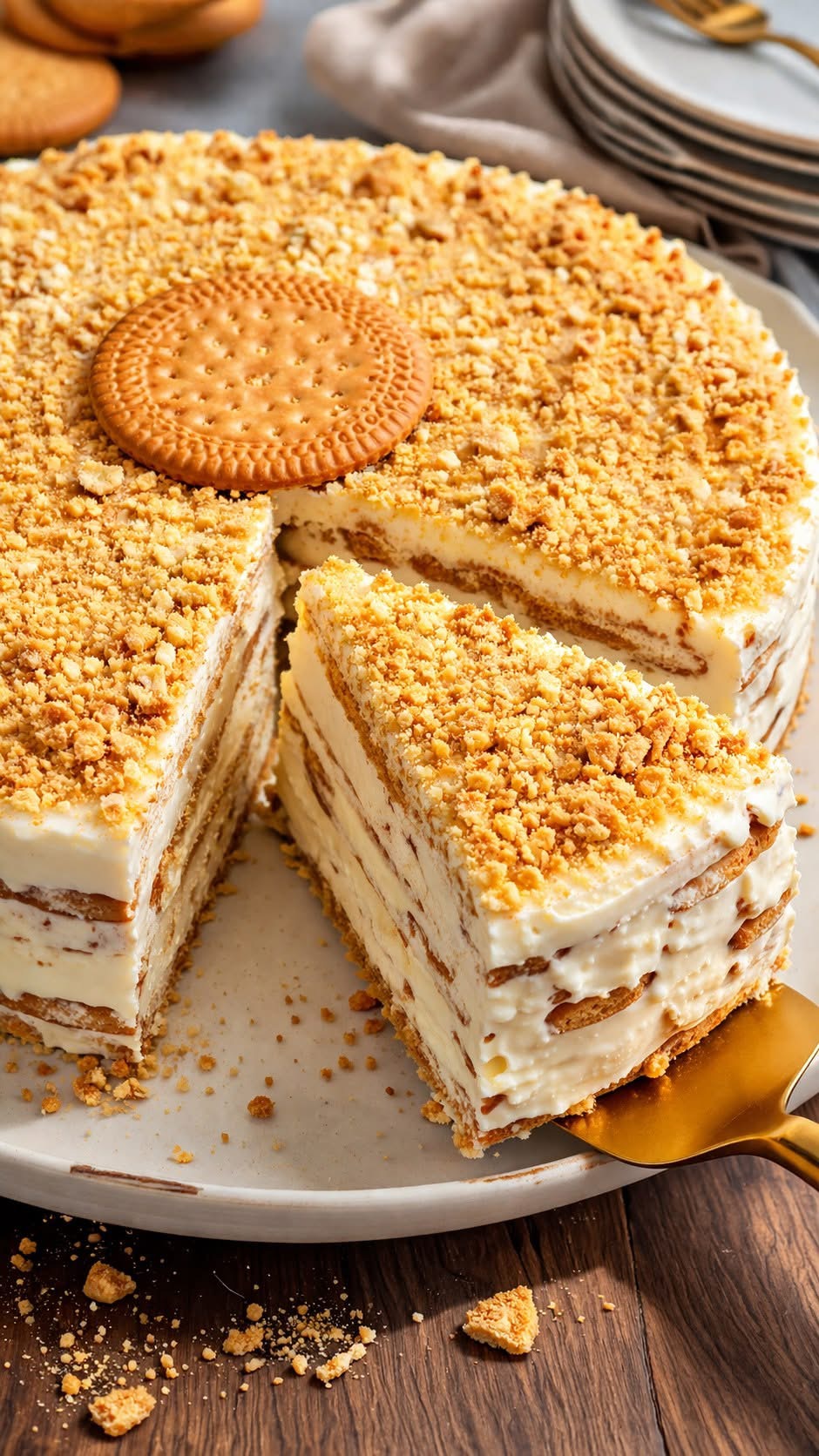 Repite el proceso alternando capas de galletas y crema hasta terminar, finalizando con crema en la parte superior.